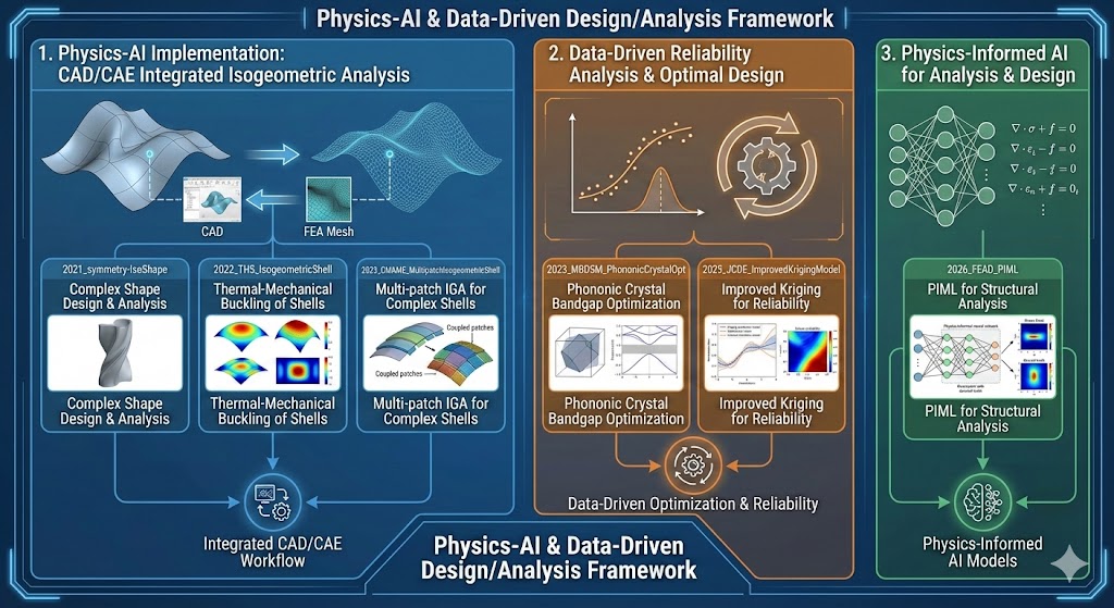2. 데이터 기반 신뢰성 해석 및 최적설계제조 공정 오차, 재료 불확실성, 하중 변동 등 현실적인 불확실성을 고려한 설계는 현대 공학에서 필수적입니다. 3. 물리지식 기반 인공지능 활용 해석 및 설계순수 데이터 기반 AI의 한계를 극복하기 위해, 물리 법칙과 수치해석 지식을 AI 모델에 내재화하는 Physics-informed / Physics-guided AI 접근법을 고려할 수 있습니다. 이를 통해 본 연구실에서는 (1) 소량 데이터 환경에서도 강건한 예측이 가능한 AI 모델 (2) 물리적으로 일관된 응답면(Surrogate model) 생성 (3) 해석–최적화–AI를 통합한 차세대 설계 자동화 프레임워크 를 구현하고자 합니다. 궁극적으로는 **해석 신뢰성과 설계 의사결정의 설명 가능성(Explainability)**을 동시에 확보하는 것을 목표로 합니다. |